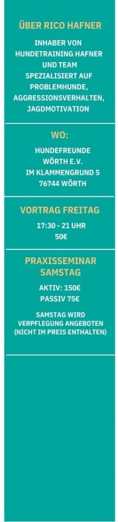 Hierfür stehen alltägliche Reize (Straße, weitere Hunde, Reizangel…), aber auch unser Gelände mit möglichen Reizen aus dem Hundesport zur Verfügung. Es wird individuell auf eure Schwierigkeiten eingegangen. Denkbar ist aber auch eine Teilnahme mit spartenübergreifenden Themen zur Impulskontrolle/Frustrationstoleranz. Rico geht hier auf jedes Team individuell ein.